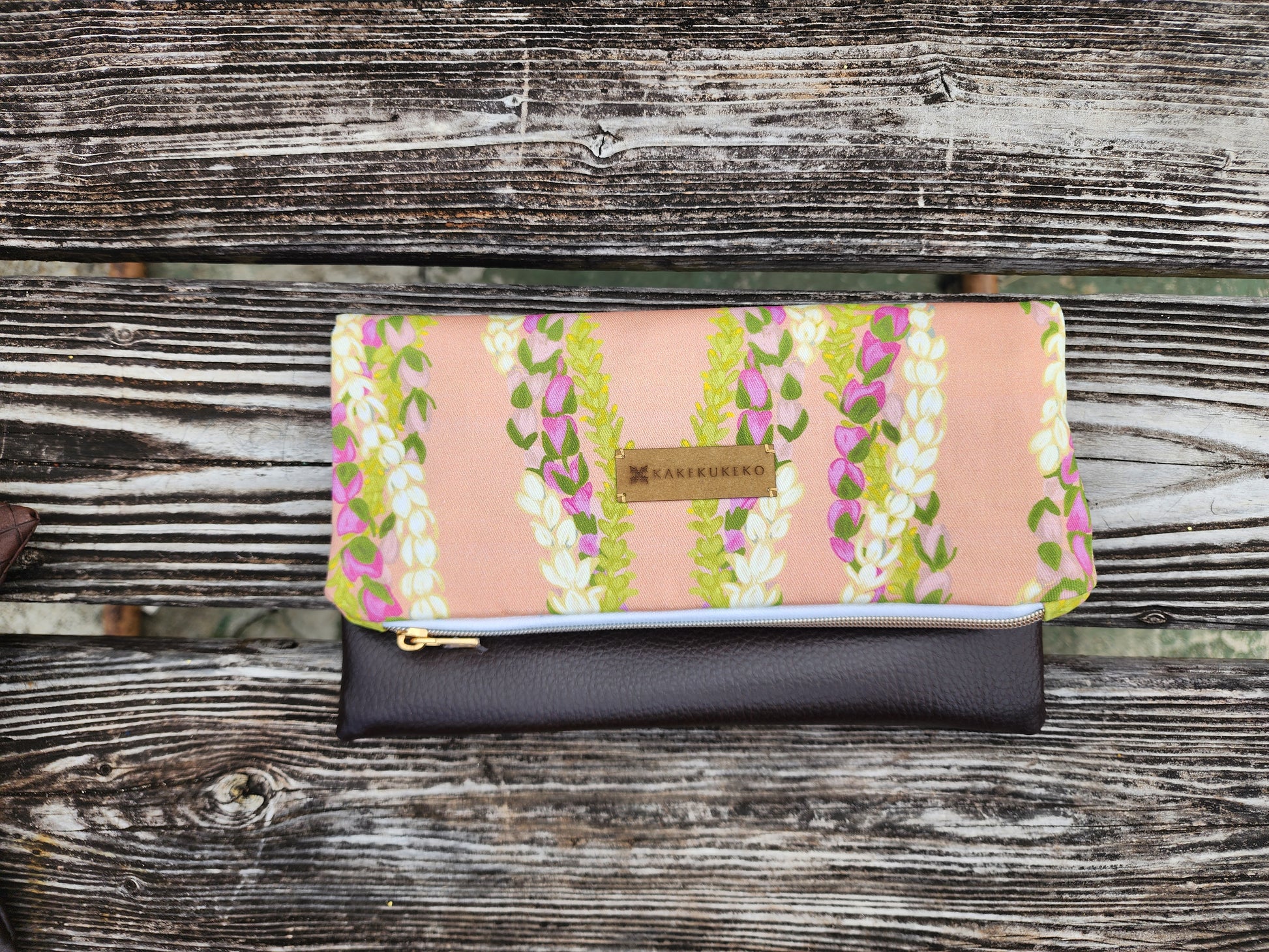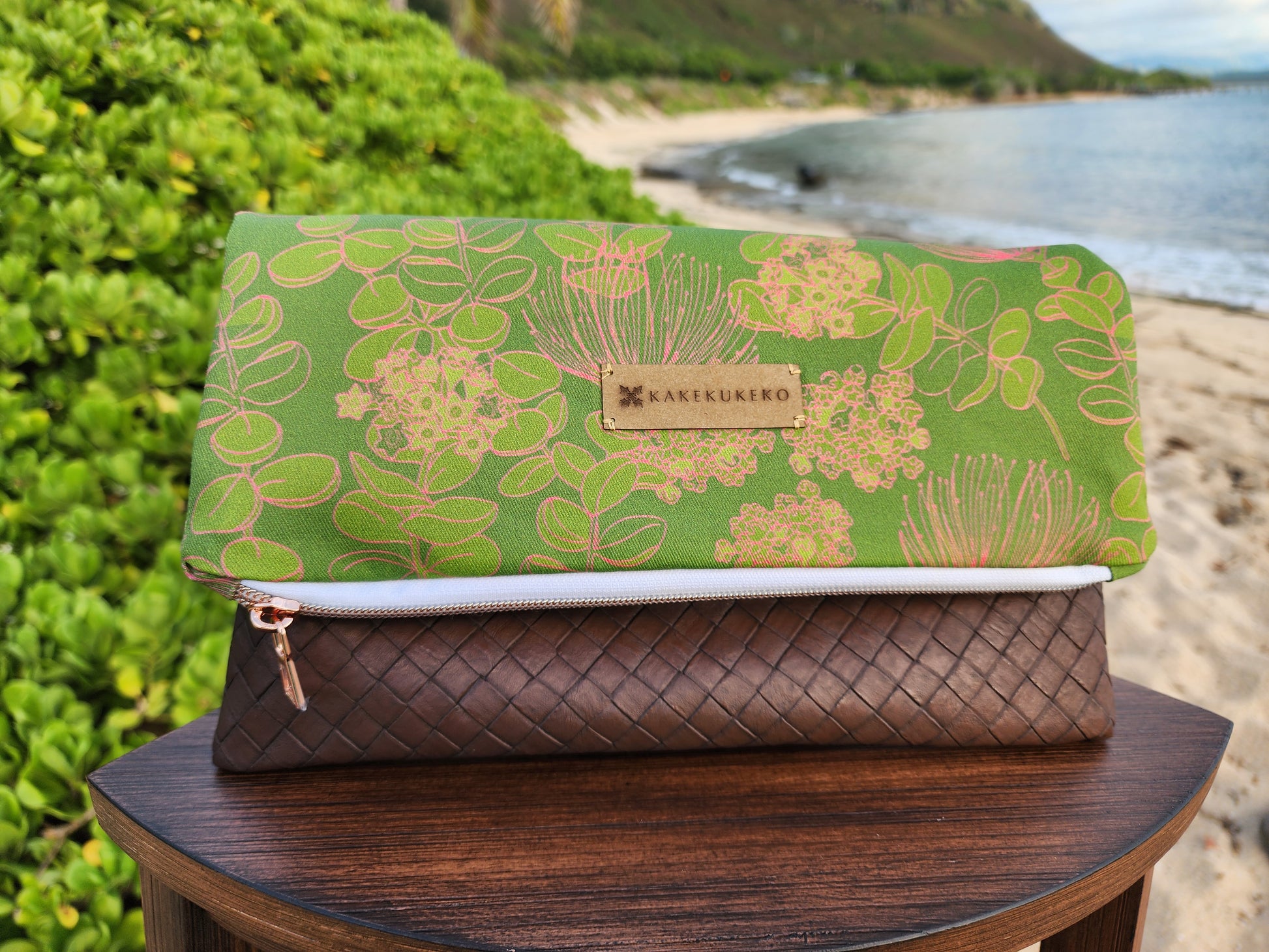"Elevate your style with this handmade Hawaii-inspired foldover clutch, featuring subtle, muted island designs that blend sophistication with tropical charm. Perfect for any occasion, the clutch is crafted with care and lined with waterproof canvas to keep your essentials safe and dry. Its versatile design offers a sleek and functional accessory that captures the serene beauty of Hawaii in a refined, understated way."